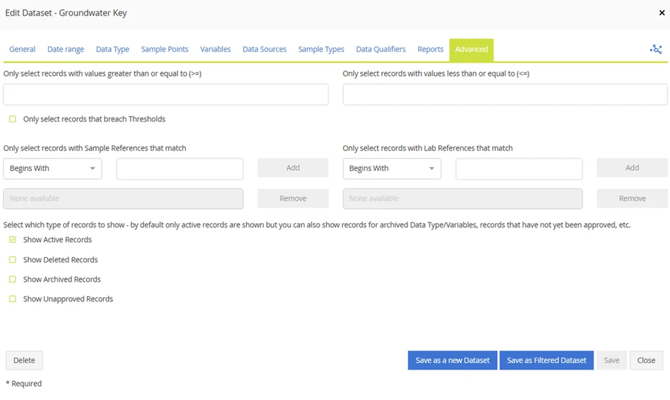 Una posibilidad es filtrar datos en base a Referencias de Muestras, Referencias de Laboratorio o Calificadores de Datos. A su vez, es posible incluir/excluir datos archivados, eliminados o no aprobados.