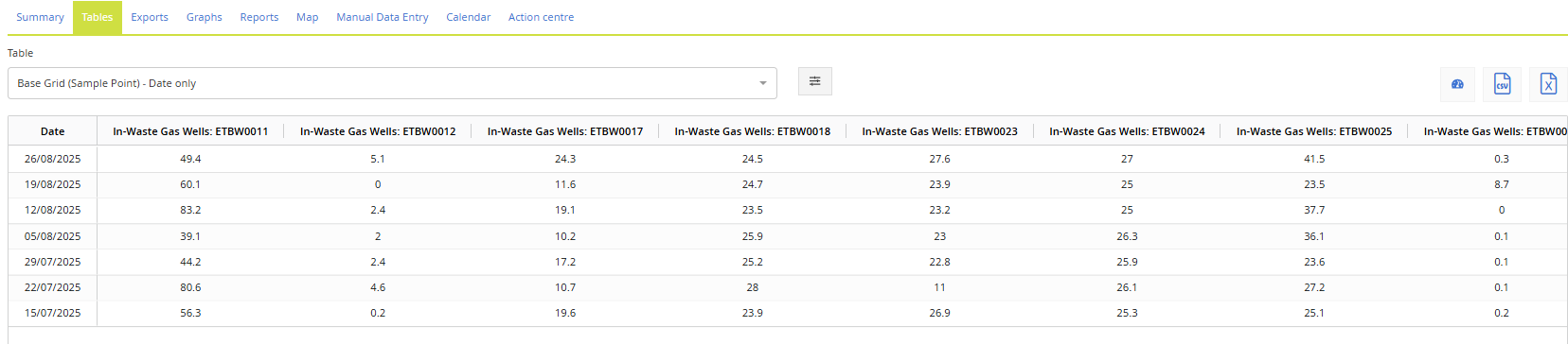 El generador de tablas de MP-Web permite crear resultados tabulares para el análisis de datos, la generación de reportes y la exportación de datos en archivos Excel. Esta nueva funcionalidad reemplaza las tablas de lista y de grilla disponibles en las versiones anteriores de MonitorPro. Los usuarios pueden seleccionar los campos que desean visualizar dentro de la tabla a partir de distintos formatos de base. También es posible combinar y filtrar datos agregando o excluyendo campos adicionales como Fuente de Datos, Tipo de Muestra u Horario de Muestreo.