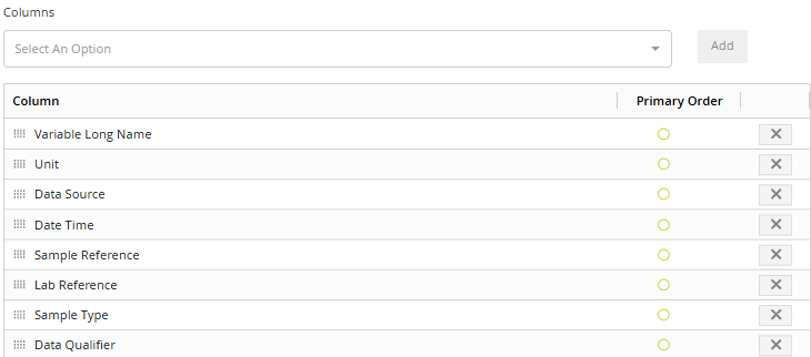 Las columnas predeterminadas se detallan a continuación. Puede excluir las columnas de acuerdo a su necesidad. En el ejemplo anterior, el conjunto de datos se ha optimizado para incluir una sola variable, fuente de datos, etc., por lo que estos campos se pueden eliminar para ofrecer una vista más simple. Sin embargo, se debe tener cuidado de no eliminar campos que, de lo contrario, provocarían la fusión de datos.