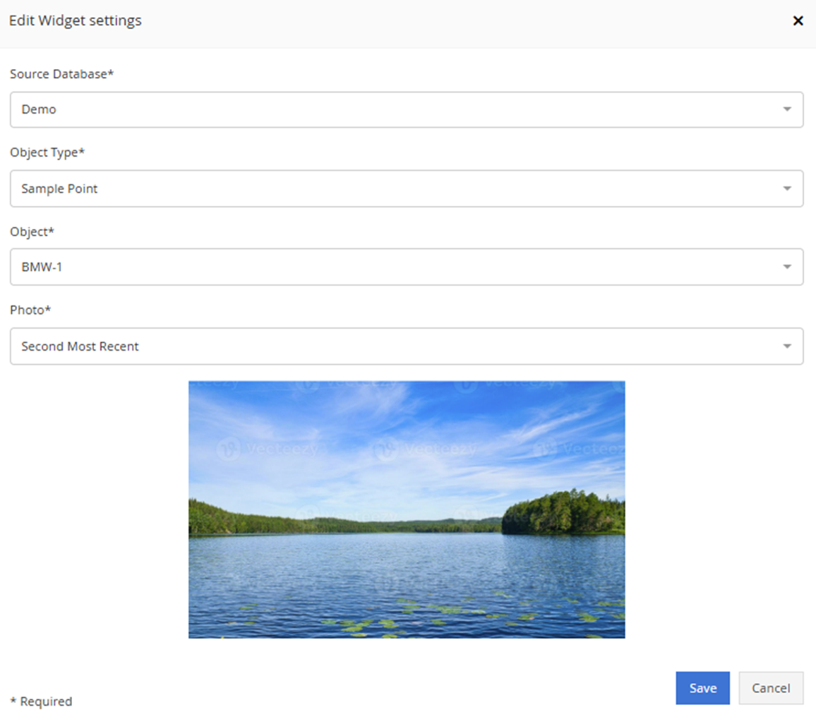 La función Photo Widgets permiten agregar fotos a un Tablero de Control (Dashboard). Es posible agregar cualquier foto que se encuentre disponible en el Gestor de Documentos (Document Manager), ya sea una imagen importada desde MP-Field, desde un Auto Importador, cargada manualmente y asociada a un Objeto (Punto de Muestreo, Variable o Fuente de Datos) o simplemente importada a través del Gestor de Documentos. A su vez, estas imágenes pueden ser estáticas o dinámicas, es decir, que cambien en base a reglas definidas.