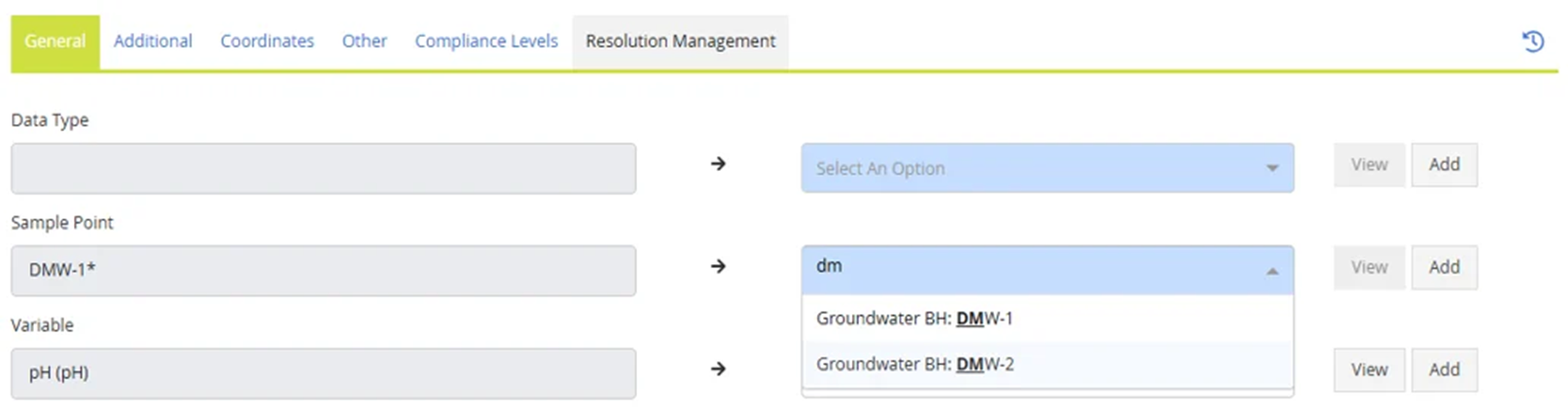 La función de búsqueda ha sido mejorada en toda la aplicación. Ahora la búsqueda devolverá entradas donde el criterio coincida con el nombre largo o corto del Objeto. Como se muestra en la imagen a continuación, al buscar un Punto de Muestreo en el Procesador de Importación, incluso aunque el Sitio/Aspecto no esté asignado, la búsqueda devolverá todos los puntos de la base de datos que cumplan con los criterios de búsqueda.
