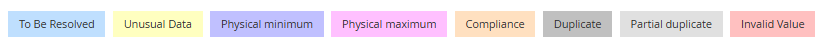Physical Min (Purple) - Data is below a Physical Min set for that variable. To import this data the Physical Min will need to be decreased or the data corrected.