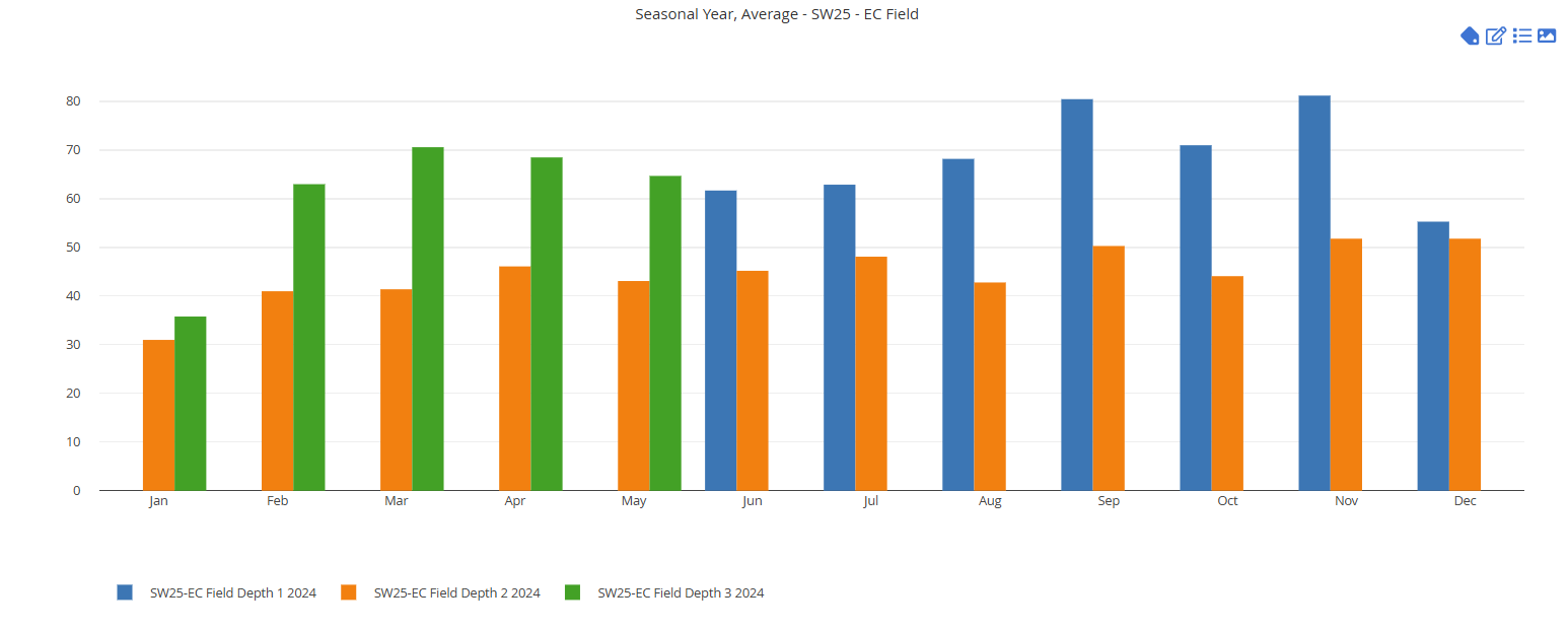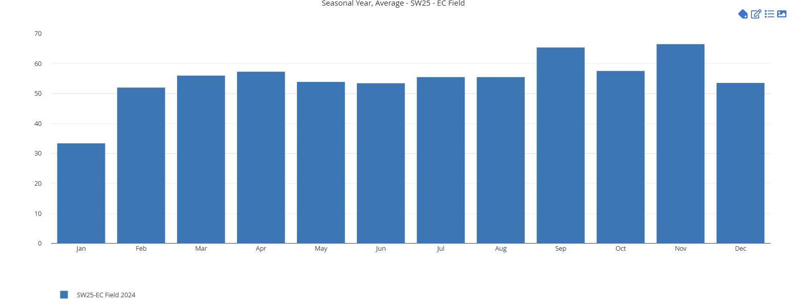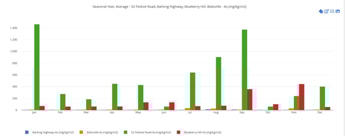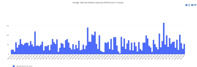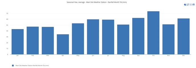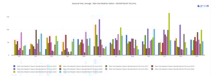 Seasonal charts, sometimes called Cyclic Charts, display trends over time and are grouped over set periods. The examples below show rainfall at a weather station over a 10-year period.
