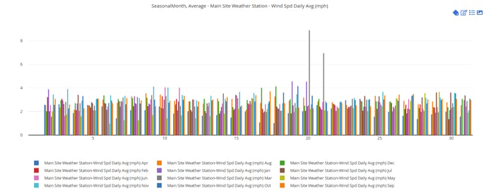 Month - Each series will be a month, and each increment of the x-axis will represent a day of the month. This is useful for more periodic data, such as daily, to observe trends over several months.