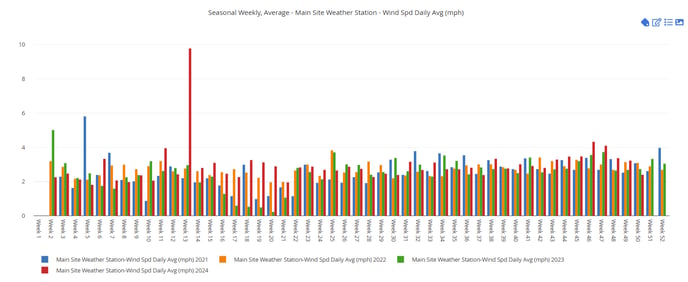 Weekly - Each series will be a year, and each increment of the x-axis will represent a week of the year. This is useful for more periodic data, such as daily, to observe trends over several years compared to the weeks of the year.