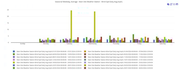 Weekdays - Each series will be a week, and each increment of the x-axis will represent a day of the week. This is useful for more periodic data, such as daily, to observe trends over several weeks.